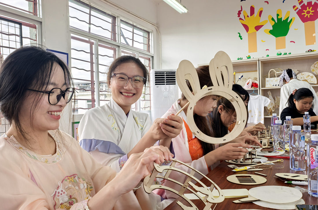 随后,活动进入游园体验环节。在“诗月相辉”飞花令区,大学生与小学生围绕“月”“秋”“家”“国”等主题词展开诗词对接,在轻松互动中感受诗词之美与家国情怀;在“巧手匠心”非遗体验区,同学们亲手制作徽州剪纸和兔子灯,体验劳动与创造的乐趣;在“徽风皖韵”故事角,大学生讲述中秋传说与地方文化,小学生则分享戴震故事,共同增强对乡土文化的认同与自豪。