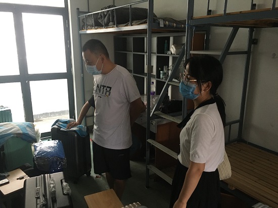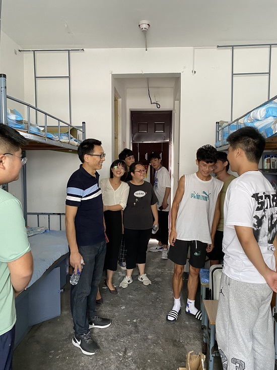 新生宿舍中,党员教师为新生答疑解惑,传达学校疫情防护措施,开展防范诈骗的教育宣传。