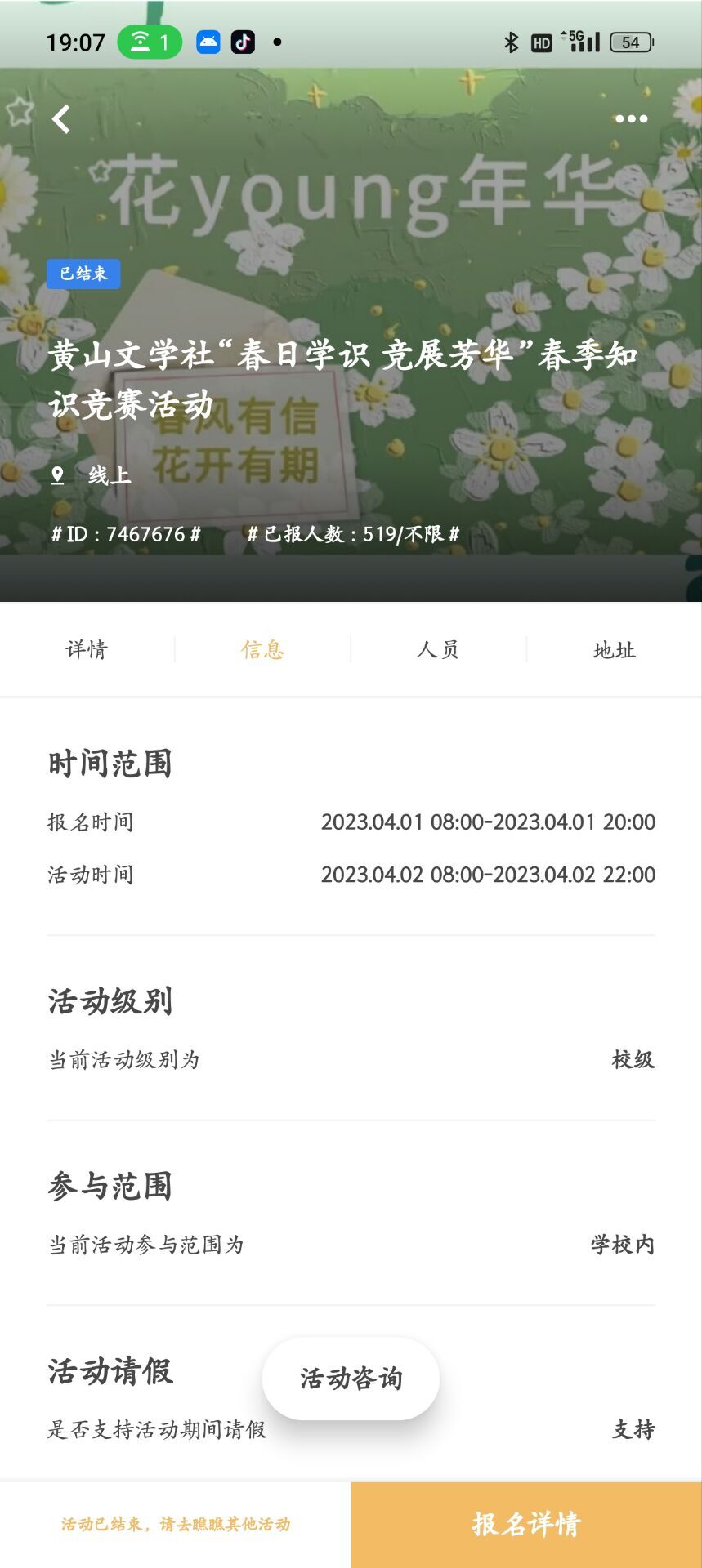 四季初始,天上有云,林间有雾,人间是春。2023年4月2日,由黄山春季知识竞赛活动圆满完结,参与人数约300人。