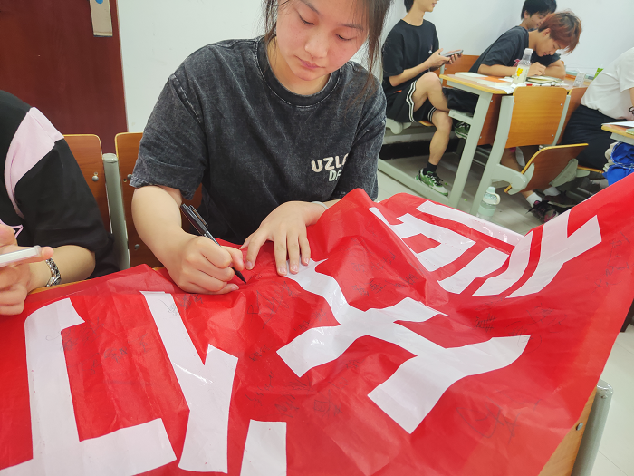 组织同学们签订《诚信承诺书》,在宣传横幅上郑重写上自己的名字,让学生对申请助学金时所提供的材料真实性等方面作书面承诺,增强仪式感。