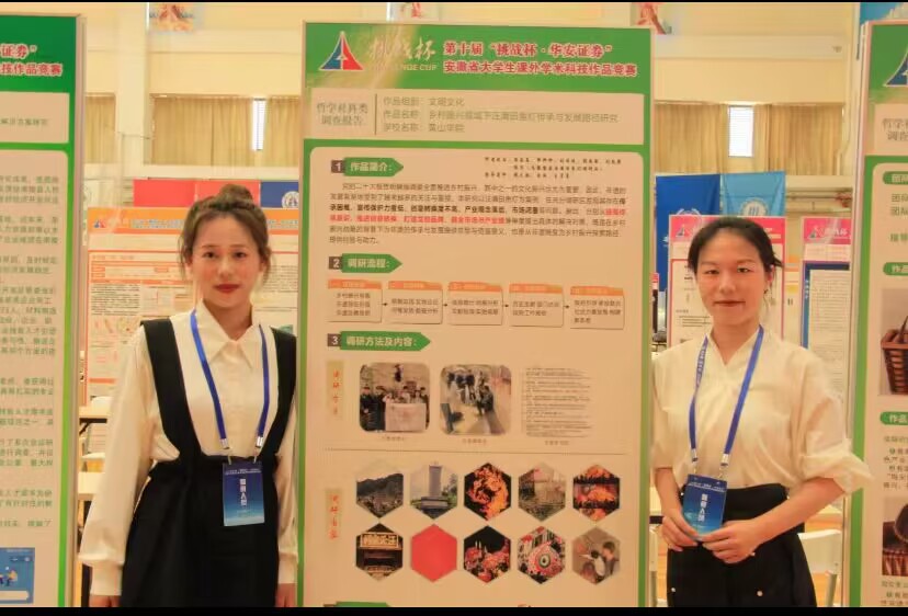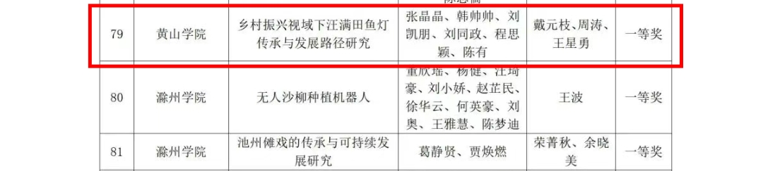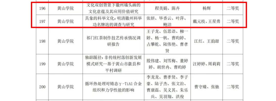 决赛中,经作品展示、线上答辩和专家评审等多个环节的激烈角逐,该院张晶晶等同学创作,周涛、王星勇老师指导的作品《乡村振兴视城下汪满田鱼灯传承与发展路径研究》获得省赛一等奖,张妍等同学设计,戴元枝、王星勇老师指导的作品《具象的科举文化:明清徽州科举功名牌坊的调查与研究》以及程美娟等同学设计,杨辉老师指导的《文化双创背景下徽州墙头画的文化意蕴及其应用价值研究》获得省赛二等奖。