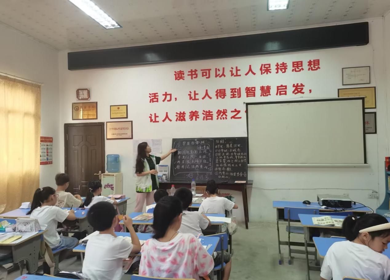 在黟县碧山村“阳光之家”农家书屋国学小课堂上,志愿者老师带领孩子们学习和朗诵《三字经》、《少年中国说》、《沁园春•雪》、《满江红》等中华经典诗词。在活动过程中,几位大学生志愿者凭借扎实的国学修养,将“汉字与文化”带入课堂中,不仅对精选出来的唐诗宋词做出了生动深入的讲解,还和孩子们一起充分互动、深情吟诵,真正沉潜到古典诗词艺术的海洋中去,不断激发孩子们学习国学的热情,让中华民族五千年的优秀传统经典融入学生的血脉,增强他们的文化自信和对自己民族和文化的热爱。