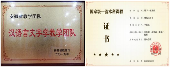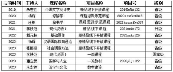 中国古代文学、汉语言文字学和现代汉语课程三个教学被评为省级教学团队,《现代汉语1》获批为国家级一流课程,《修辞学》《秘书学》被评为省级课程思政示范课程,《中国文学批评史》等获批省级线下课程(原精品线下开放课程),《国学与人生》等获批省级一流教材。