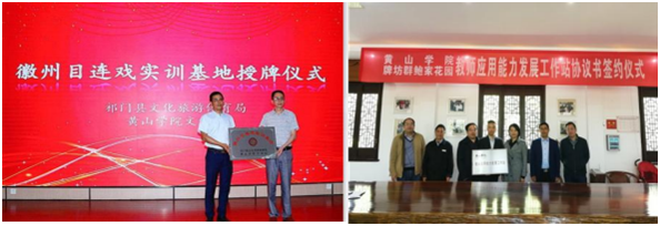 与屯溪区江南实验小学、休宁中学等单位合作,开展中华优秀传统文化 进校园活动,产生了良好社会反响。学院秉持学校地方性应用型的办学定位,积极开展校地合作。先后与黄山市文投公司、歙县牌坊群鲍家花园开发有限 公司、祁门县文旅局等单位签订合作协议,就目连戏保护传承、文化资源开 发利用、文化产业创意策划等进行产学研用深度合作。期间给地方企事业单 位提供业务培训300余次,为地方单位提供科研服务30人次;参与地方村 志研究撰写3人次,其中《许村志》获省社科三等奖。