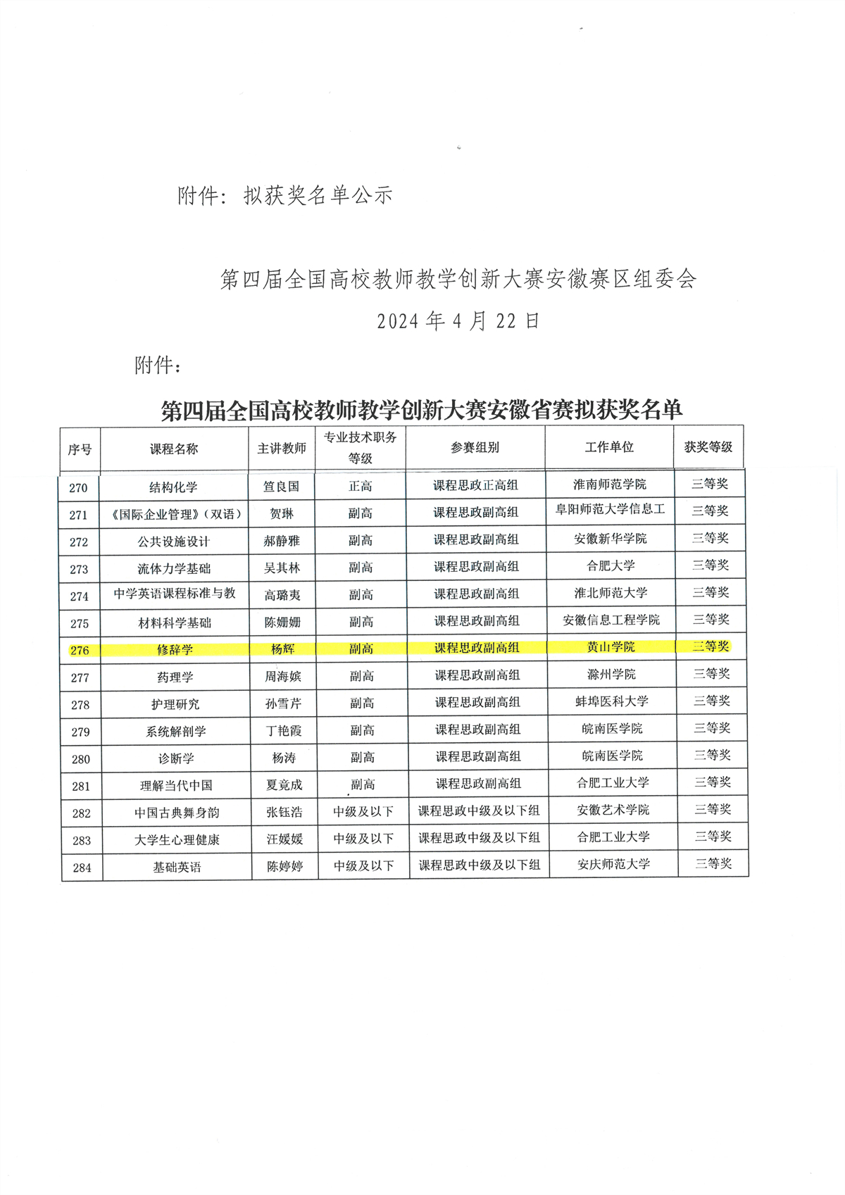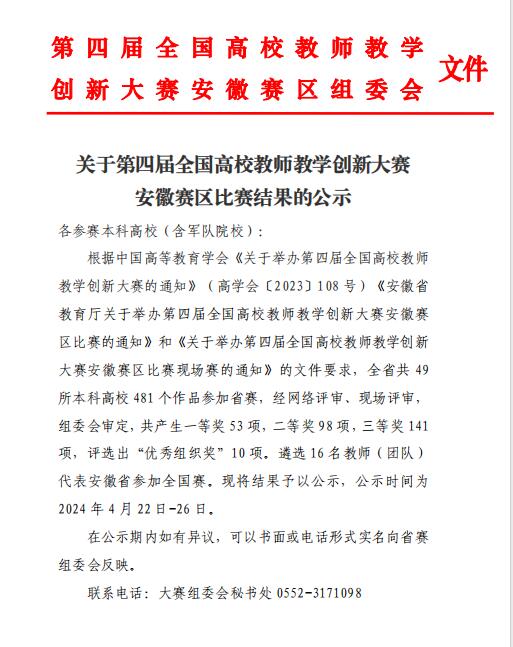 据安徽省高等学校教师教学发展联盟《关于第四届全国高校教师教学创新大赛安徽赛区比赛结果的公示》文件,英国365集团杨辉老师《修辞学》教学团队荣获课程思政副高组三等奖。本次大赛由安徽省教育厅主办,安徽财经大学承办,以“推动教学创新、培养一流人才”为主题,共设置新工科、新医科、新农科、新文科、基础课程6个组别。大赛分为网络评审和现场评审两个环节,全省49所本科高校481个作品参加省赛。
