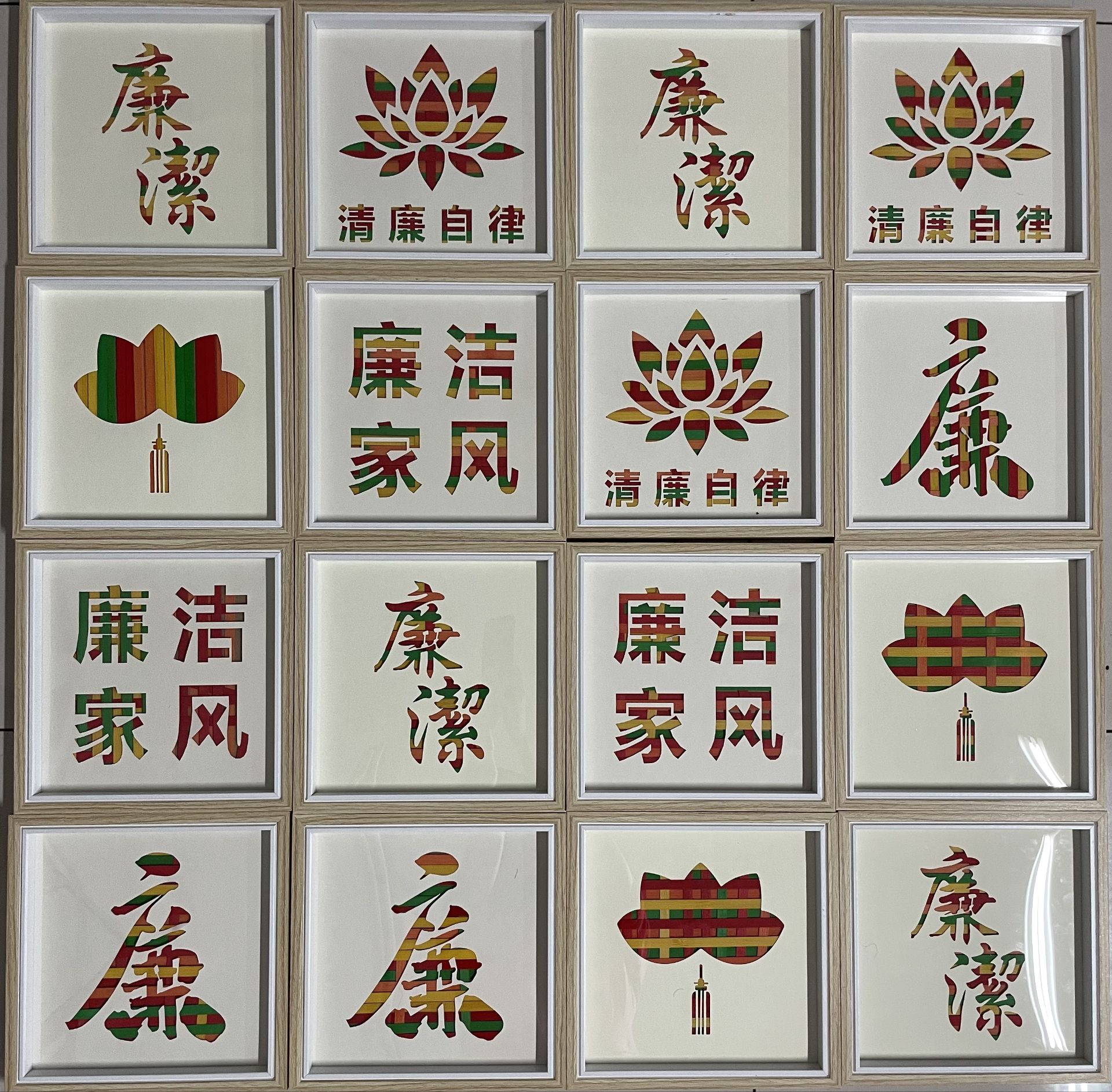 活动中,同学们两人一组,分工协作,用手中的竹条和编织工具,编织出五颜六色的竹编作为背景,再用剪纸剪出廉洁相关的字词、图案,制作成一幅幅精美的竹编画作品,具有一定的观赏价值和警示作用,同时又让大家体会到了劳动的快乐。