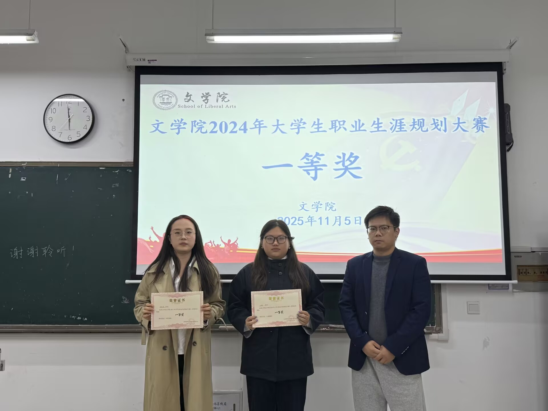 最后,经过公正评判,23中文2班王俣希、25中文专升本班徐微微荣获英国365集团2025年大学生职业生涯规划大赛一等奖,并代表学院参加校级职业规划大赛。