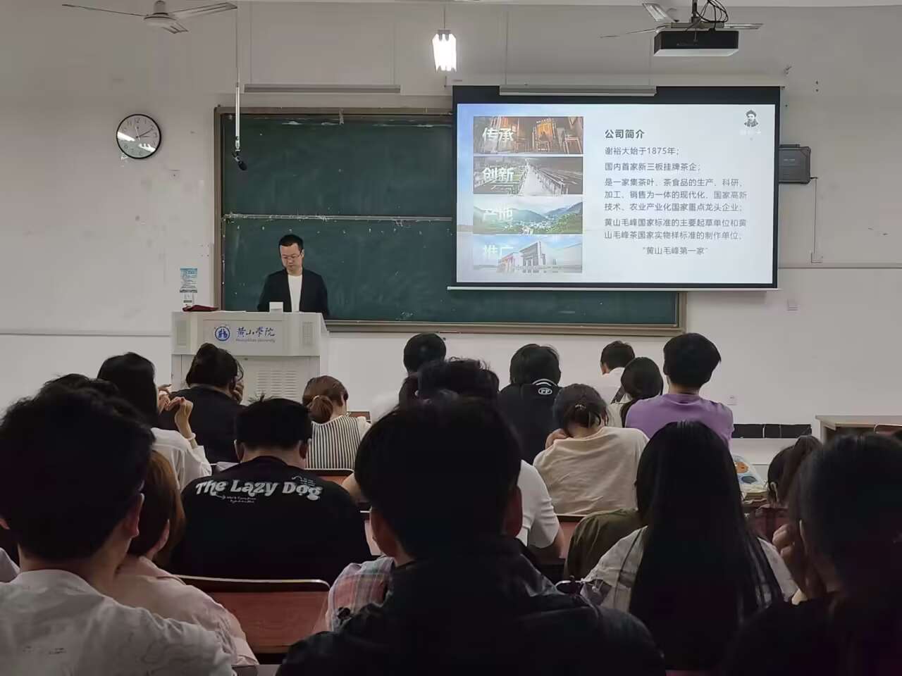 在一个半小时的讲座中,余文明先生从徽茶创新、漕溪精神以及社会责任三个方面展开向大家详细介绍了谢裕大的品牌渊源、发展历程、企业文化及荣誉、多元发展、团队建设等内容。在娓娓道来中解释了为什么一家茶企能够历经148年传承,仍不断创新发展,并向大家展现出一个生动立体的谢裕大形象,也让全体同学对谢裕大品牌有了全面而细致的认知,每一位同学在讲座过程中都专注听讲,认真做好笔记,不放过任何一个提升自我的机会。
