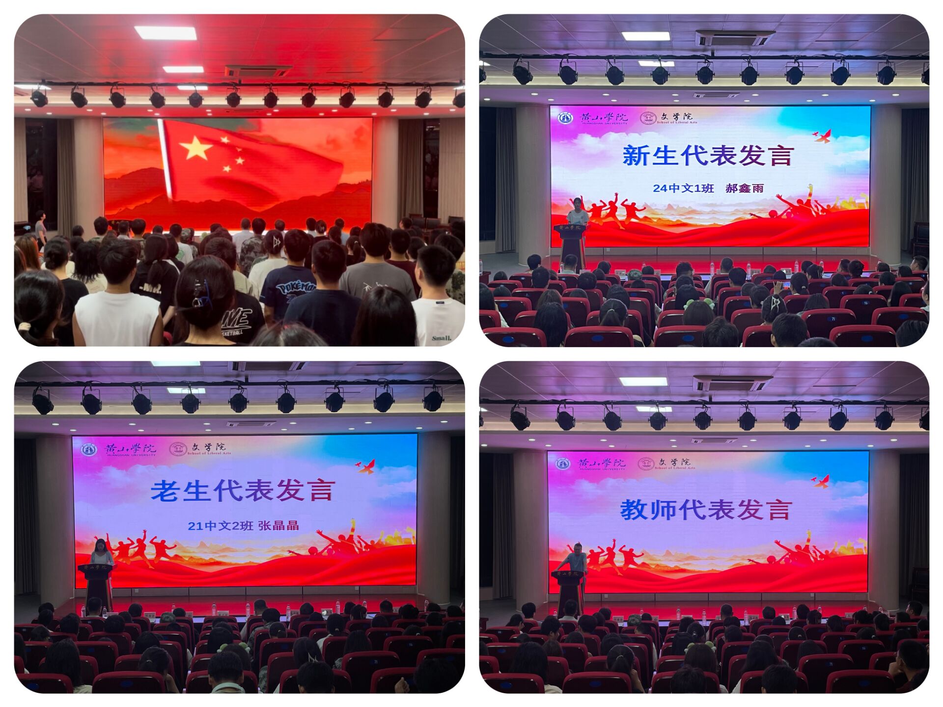 开学典礼以雄壮的奏唱国歌仪式拉开序幕,随后师生代表做了激情洋溢的发言。新生代表 24级中文一班郝鑫雨号召大家保持热爱和初心,努力学习中国语言和文学,用向善向真向美的少年气去拥抱学习和生活。老生代表21级中文二班张晶晶用亲身经历告诉新生们在求学过程中应孜孜不倦,在集体中相互包容,课上认真听课,课下多去图书馆,课外积极参加实践活动,合理分配时间,做好统筹兼顾。吴夜老师作为教师代表向同学们表达了欢迎和祝贺,告诉同学们如何提升文学素养,培养人文情怀,强调多读多思多写的好处,并提出了建议和要求,希望大家读万卷书,行万里路,真正做到知行合一。