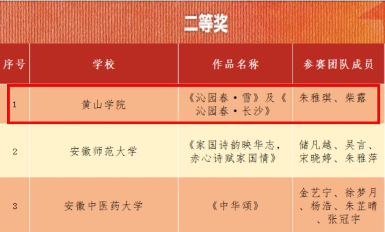 11月20日,我院22中文1班朱雅琪、22汉教班柴露凭借“沁园春长·沙”和“沁园春·雪”两部作品在安徽省高校古典诗词朗诵比赛中荣获二等奖。