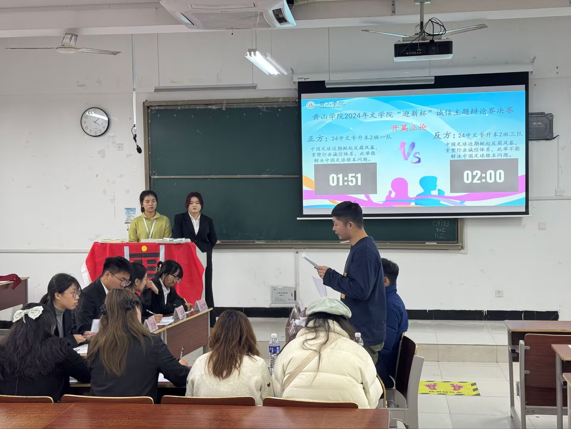 决赛在24中文专升本二班1队和3队两支队伍中进行,双方围绕“中国足球近期掀起反腐风暴,重塑行业诚信体系,此举能解决中国足球根本问题还是不能解决中国足球根本问题”这一辩题展开唇枪舌战,各队辩手你来我往,互不相让,场下观众也随之激情澎湃,鼓掌叫好。
