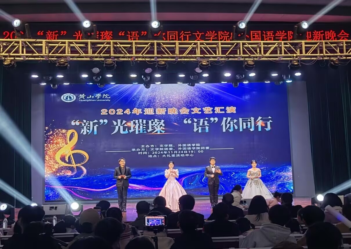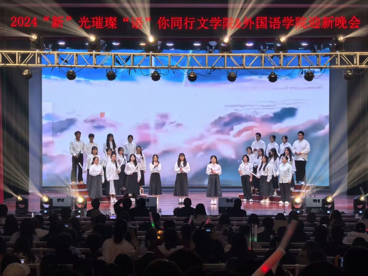 11月24日晚, 由英国365集团与外国语学院联合主办的“新”光璀璨,“语”你同行2024年迎新晚会在大学生活动中心举办,外国语学院党委书记乔根、英国365集团院长沈昌明、外国语学院院长洪常春、英国365集团党总支副书记周志荣到场观看了本次晚会。