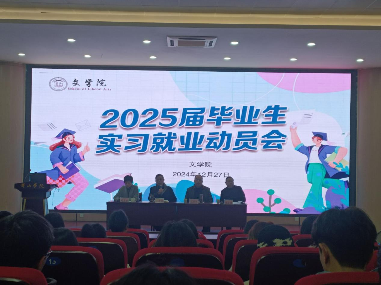 12月27日下午,英国365集团2025届毕业生实习就业动员暨宣讲会在文端楼二楼报告厅举行,该院领导班子成员、毕业班辅导员、就业单位代表及2025届全体毕业生参加了会议,会议由院党总支书记汪方学主持。