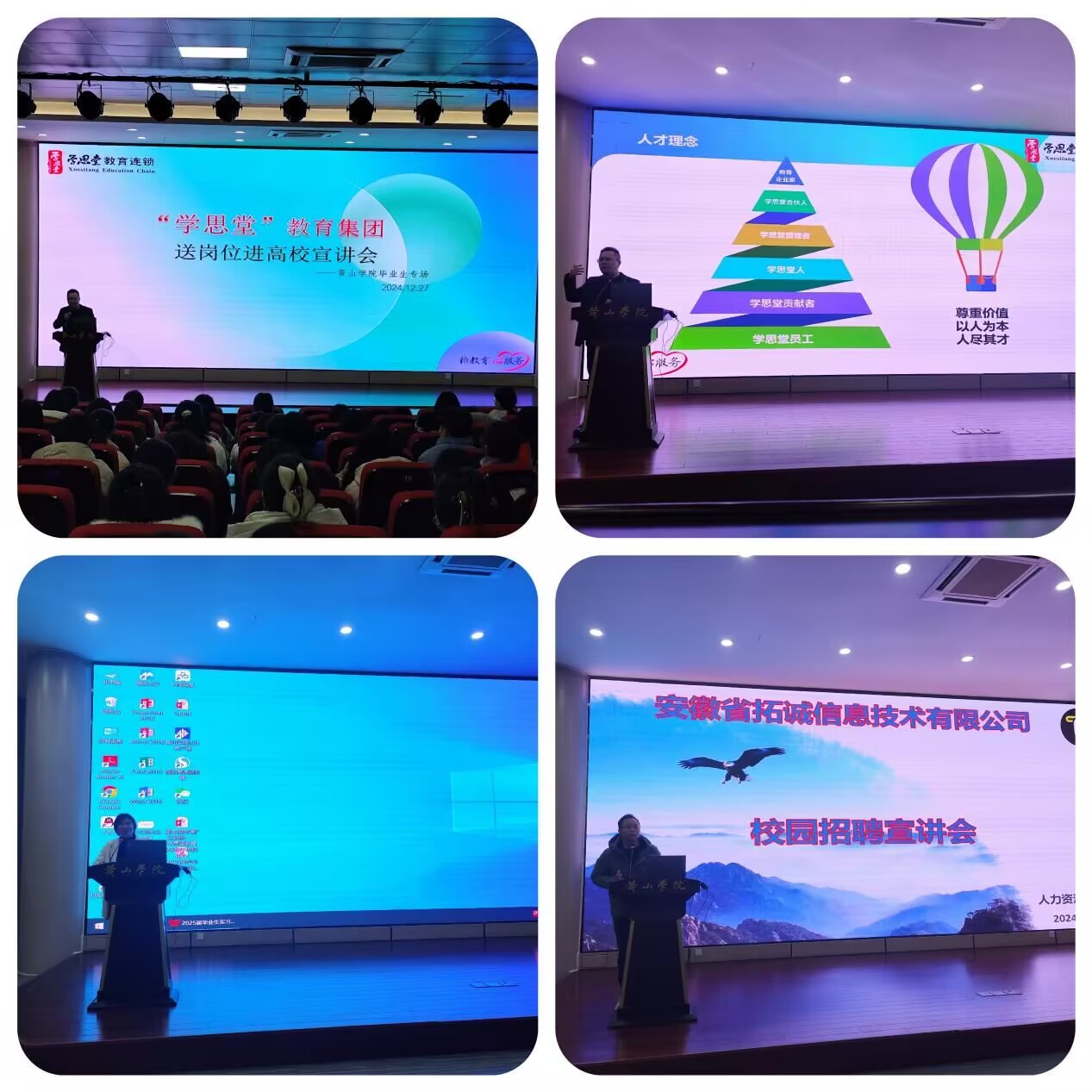 就业单位宣讲环节邀请到了江苏、浙江学思堂教育科技有限公司、安徽拓诚信息技术有限公司、安徽久恒档案技术有限公司等就业单位进行招聘宣讲。各企业代表通过放映宣传片和PPT演示的方式,向同学们介绍企业规模、企业业务、企业文化、薪资待遇、员工晋升机制等多方面内容,并与同学们进行了互动交流。